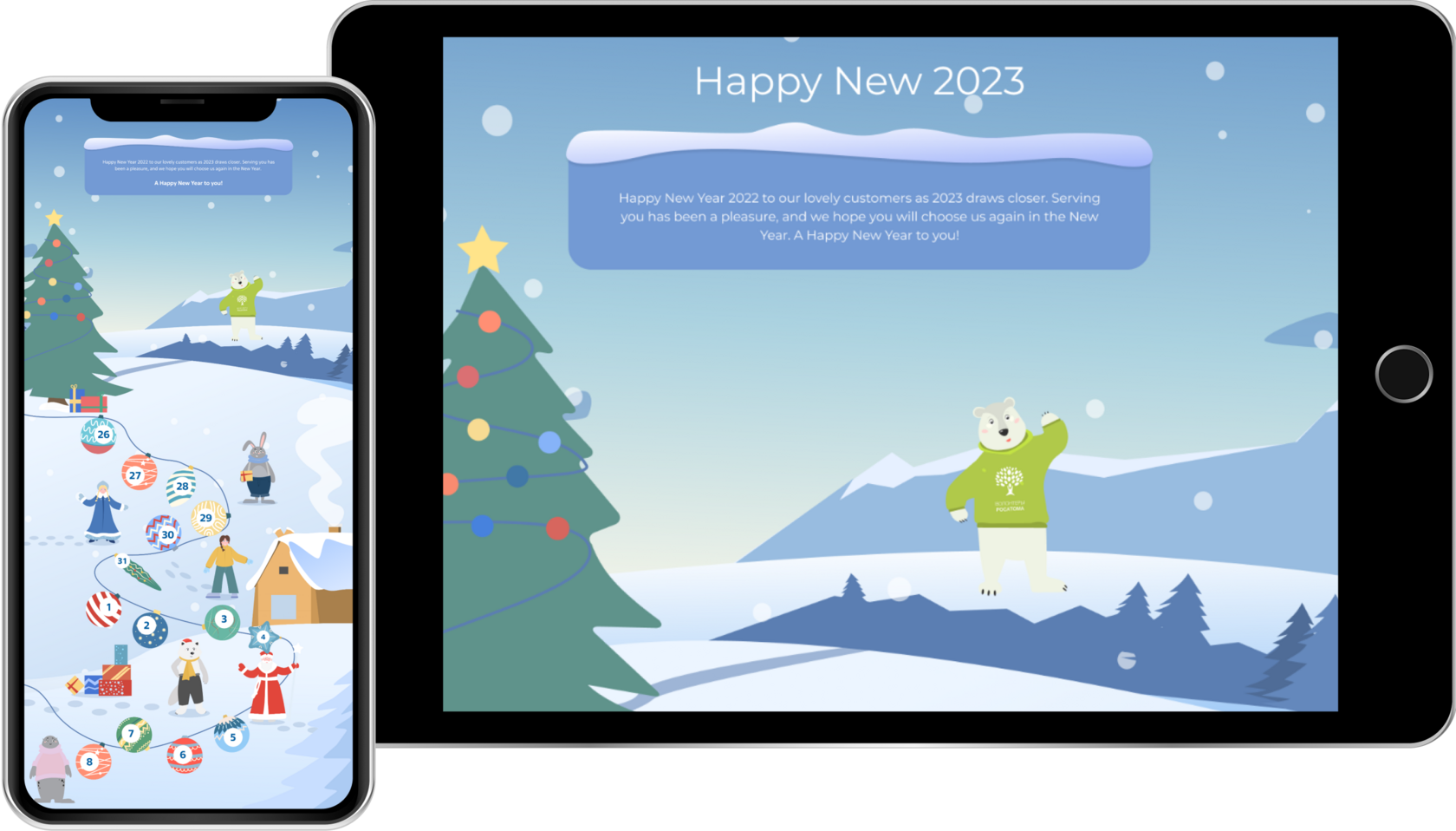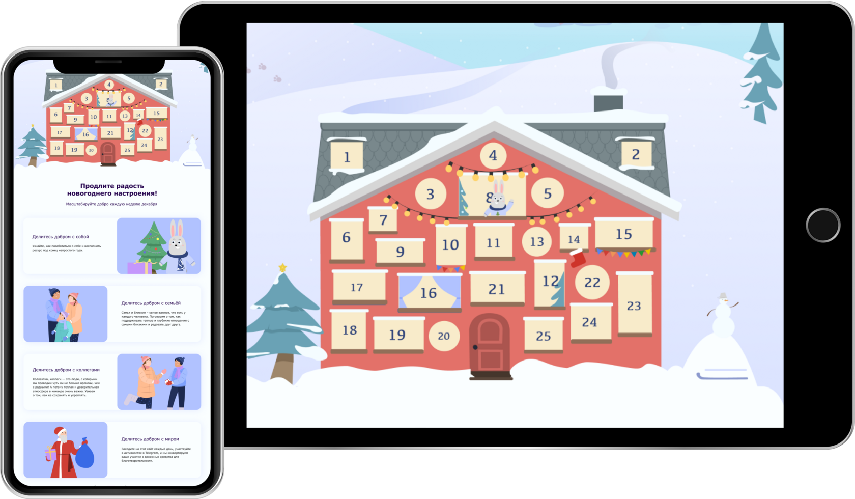 Перед нами была поставлена задача разработать уникальный веб-сайт для сотрудников компании в рождественской и новогодней тематике. Он был выполнен в формате адвент-календаря, где каждый день открывалось новое окно и сотрудникам предлагались новые занятия (например, кулинарные рецепты, настольные игры, фотоконкурс и т.д.).